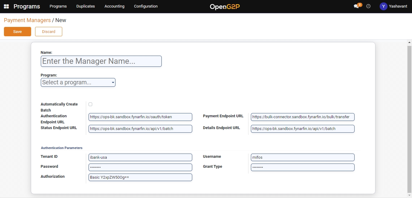 In the payment manager creation page provide a name for the payment manager, select the program name, select Automatically Create batch if needed, and all the other configurations will auto-populate and can be changed accordingly.