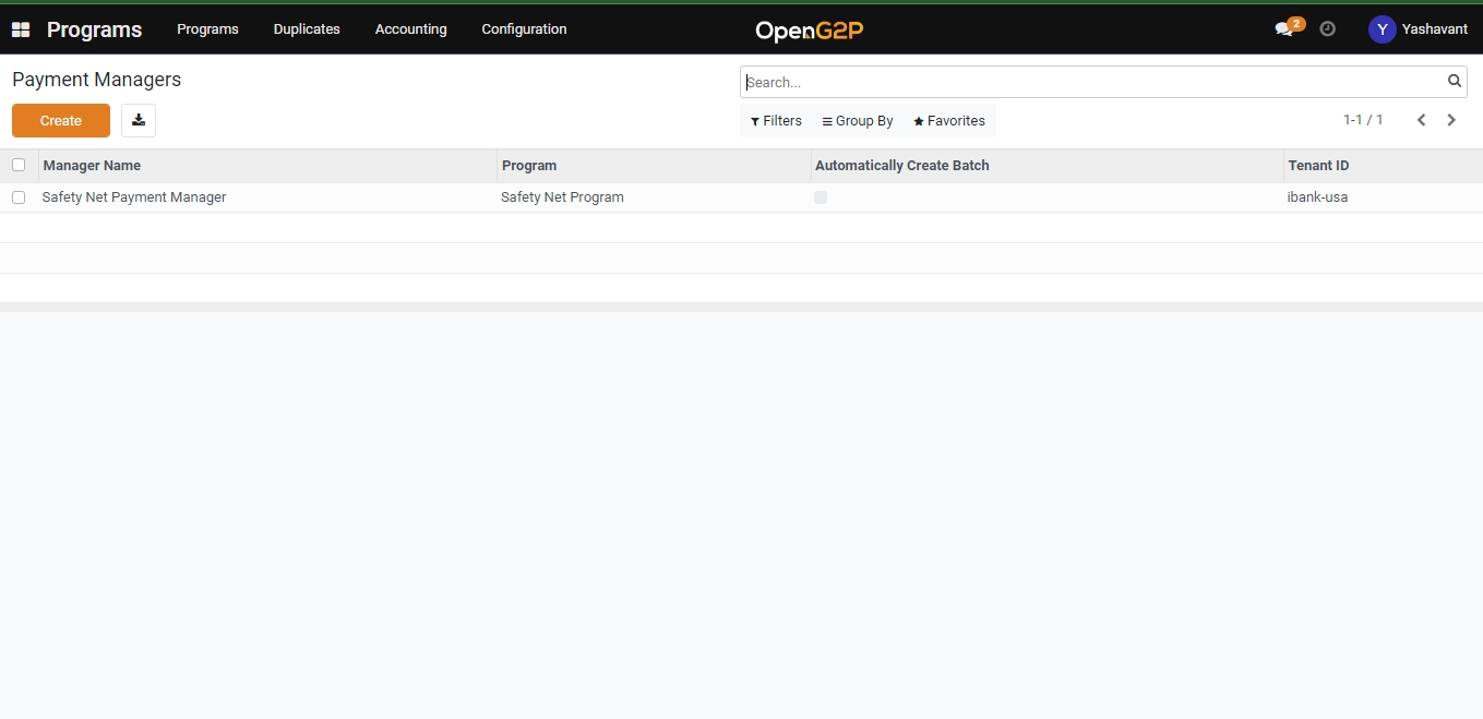 Once the payment manager is saved it will be listed under the payment manager list view page which further can be used under the program configuration for which it was created.