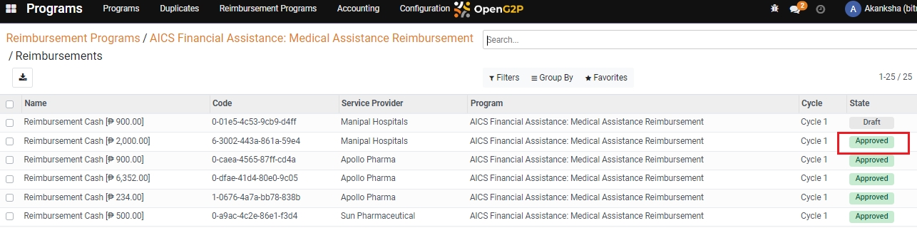 Select the service provider to be reimbursed. The reimbursement status for the service provider is shown as Draft.