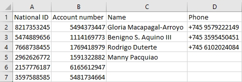 Administrator must have a .csv file which contains the bulk FA data of the beneficiaries in the required format. To know the format of the .csv file, refer the sample_data.csv file available in the cloned repository. In .csv file, the mandatory columns are National ID and Account number. The optional columns are Name and Phone.