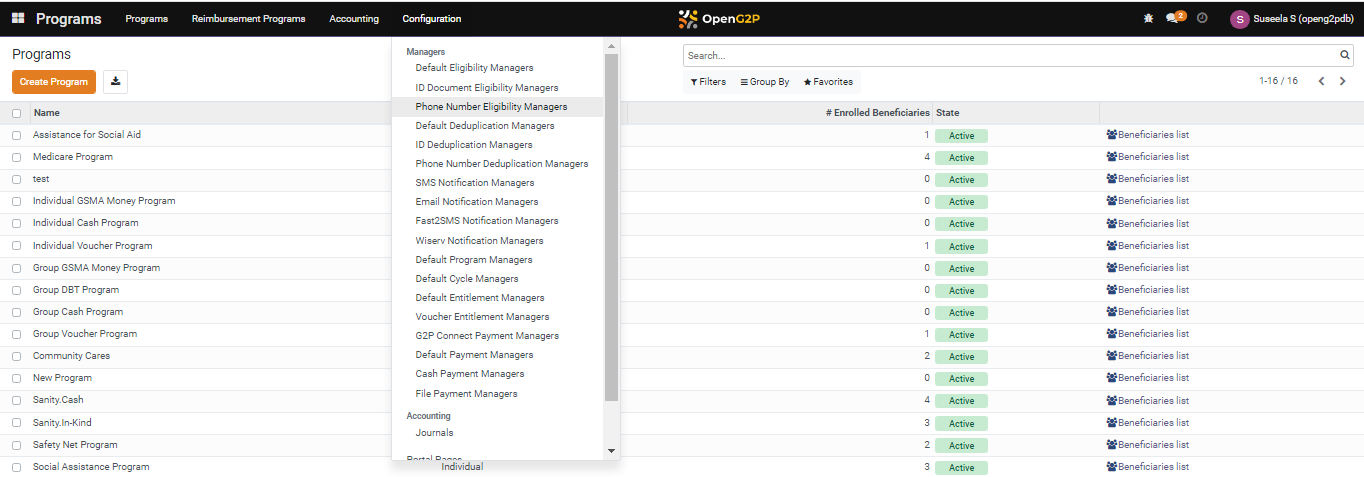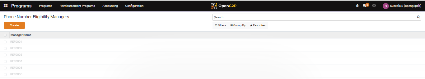 Phone Number Eligibility Managers screen provides dashboard view which lists all the Manager Names and the Program list.