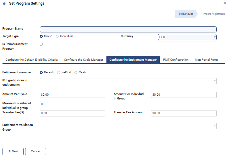 | Entitlement manger                    | <p>Select the parameters for entitlements. The valid values are:</p><ul><li>Default</li><li>In-Kind</li><li>Cash</li></ul>                                                                                                                                                                                            |