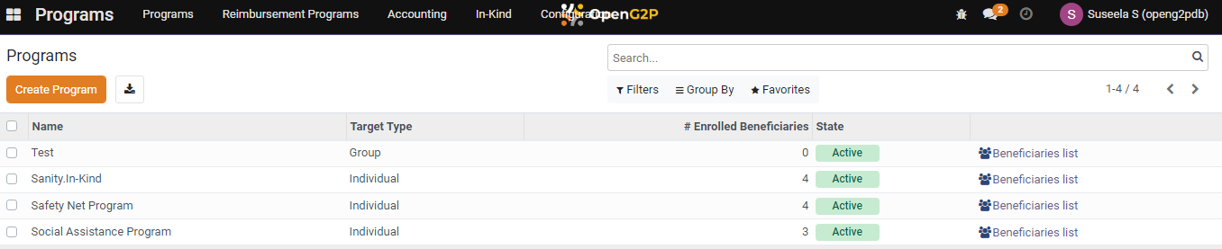 ***Programs*** screen provides dashboard view which lists all the available Program Names, Target Type, Number of Enrolled Beneficiaries against each program, State (whether active/inactive), and the Beneficiaries list.