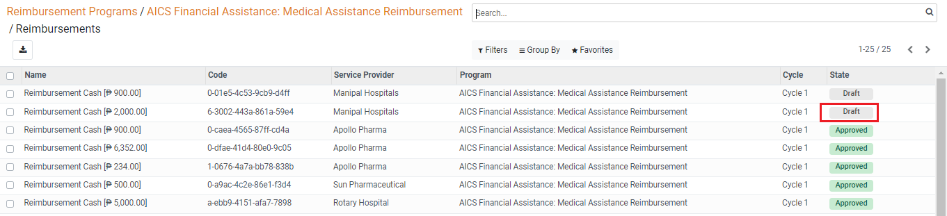 5. Select the service provider to be reimbursed. The reimbursement status for the service provider is shown as *Draft*.