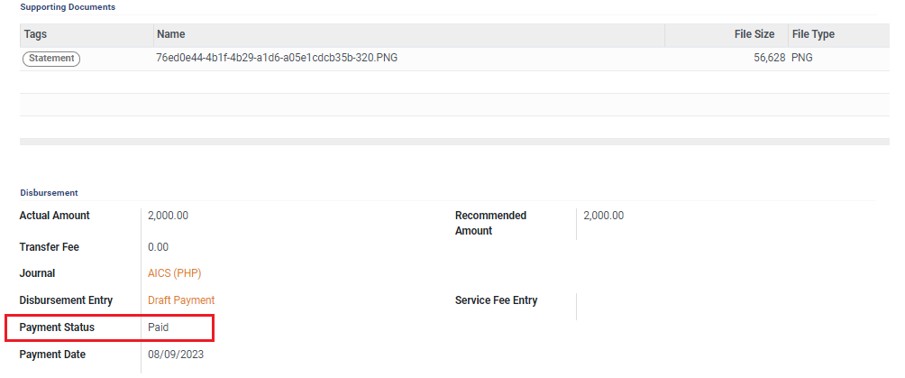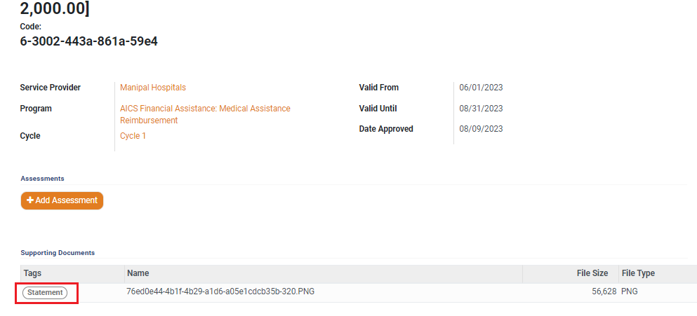 6. Clicking on the selected service provider row opens the reimbursement cash page. Click on *Statement* under *Supporting Documents* to review the document on this page.