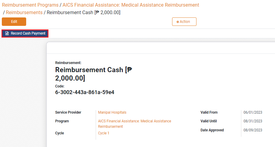 9. Once the reimbursement is approved, a new button *Record Cash Payment* appears. Click on this button.